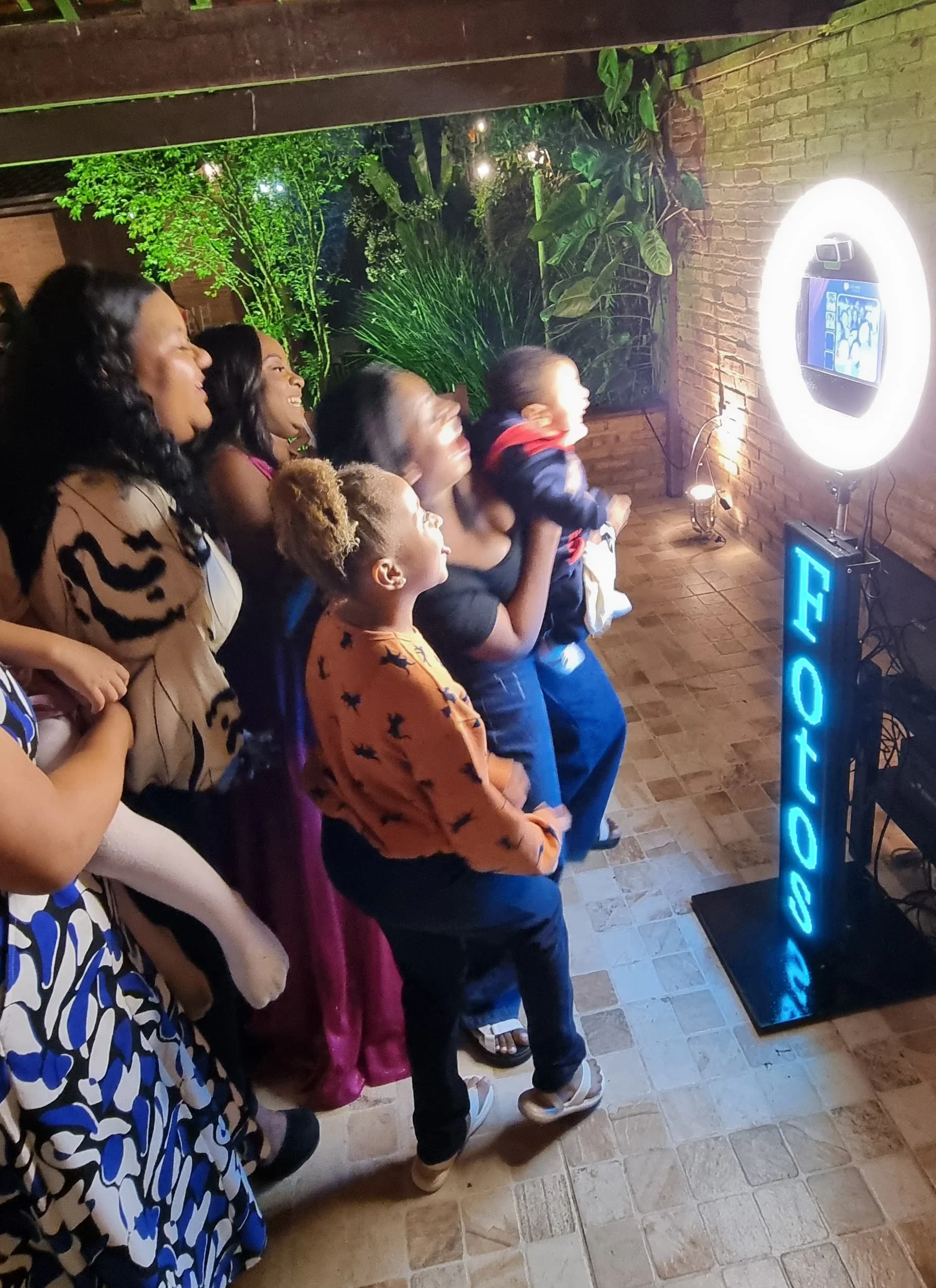 Um grupo do convidados se posicionam em frente ao totem e seguem as instruções exibidas na tela, e com apenas um toque se inicia uma sessão de fotos descontraídas com quatro poses e levam essa lembrança inesquecível de seu evento. A foto é impressa em apenas 10 segundos em papel fotográfico!